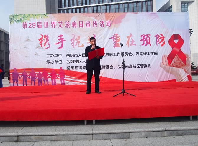 校园网讯 12月1日上午,由岳阳市人民政府防治艾滋病工作委员会和我校联合主办的“携手抗艾,重在预防”第29届世界艾滋病日宣传活动在南院举行。岳阳市人民政府副市长李为,学校党委委员、副校长刘亦工,岳阳市政府副秘书长陈峰,岳阳市卫计委主任彭纲要等领导出席。