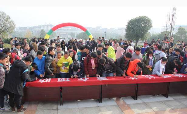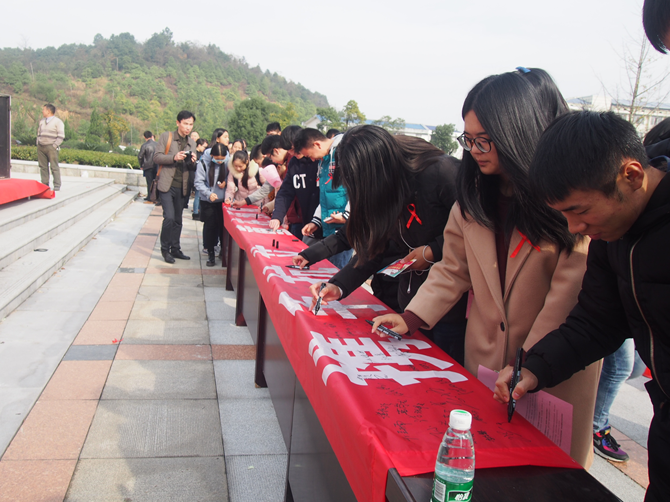 广大学生在“携手抗艾,重在预防”的横幅上签名
