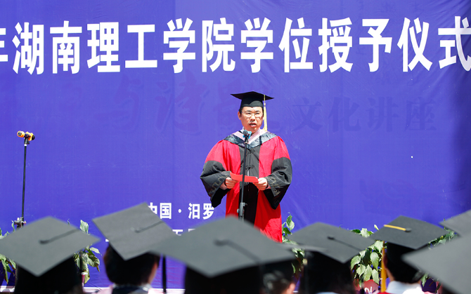 仪式上,校长卢先明致辞并宣布了此次学士学位授予名单。他指出,在汨罗江畔举行学位授予仪式,是我校与汨罗市政府共建产教研融合基地的成果展示。他希望通过这一实践教育形式,引导即将步入社会的毕业生传承优秀传统文化,培育和践行社会主义核心价值观,树立和坚持正确的历史观、民族观、国家观、文化观,为实现中华民族伟大复兴的中国梦做出自己的贡献。卢先明表示,我校将积极和汨罗市政府合作共建屈原文化研究基地,促进汨罗市社会文化和我校人才培养、科学研究、社会服务、文化传承水平的共同提升。