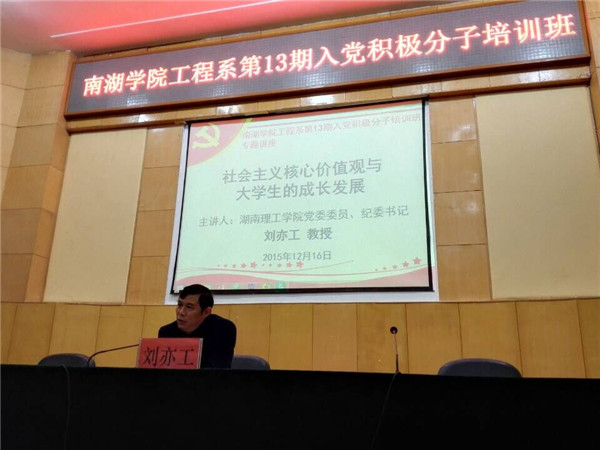 校园网讯 12月16日晚,学校纪委书记刘亦工应邀到南湖学院工程系讲党课。刘亦工以“社会主义核心价值观与大学生的成长发展”为题,为工程系第13期入党积极分子培训班学员上了一堂内容详实的党课。