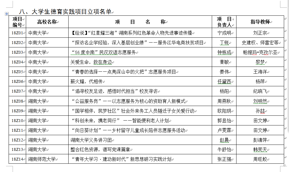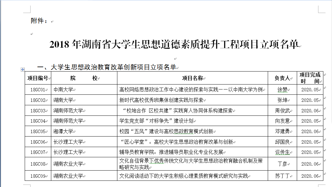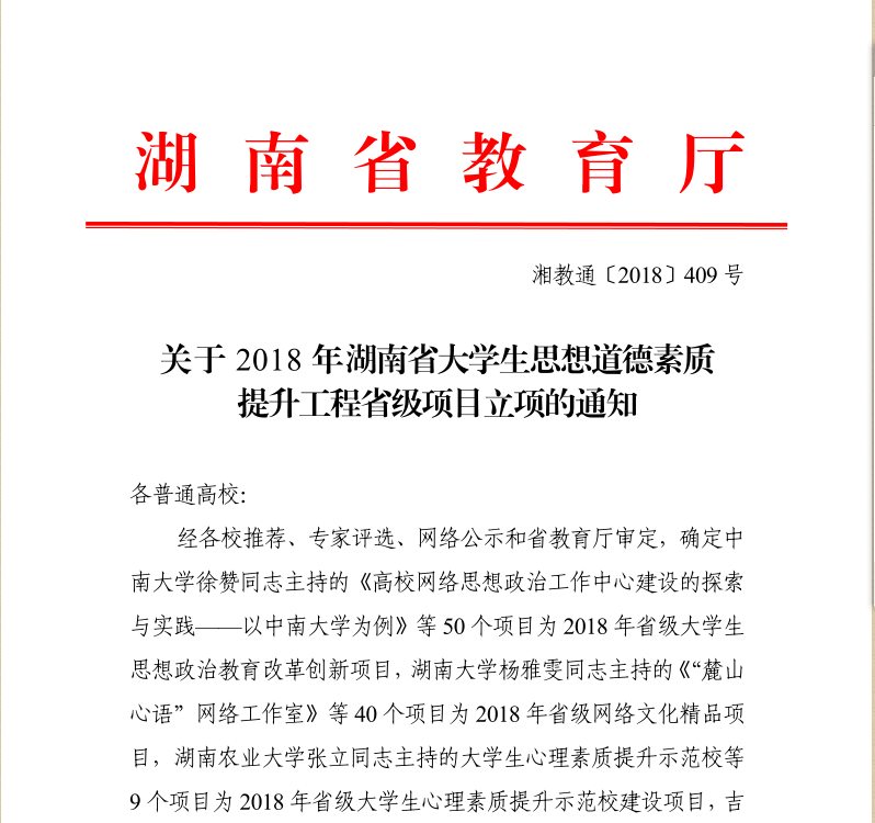 近日,湖南省教育厅下发了《关于2018年湖南省大学生思想道德素质提升工程省级项目立项的通知》,我校共有7个项目获得2018年湖南省大学生思想道德素质提升工程项目立项。