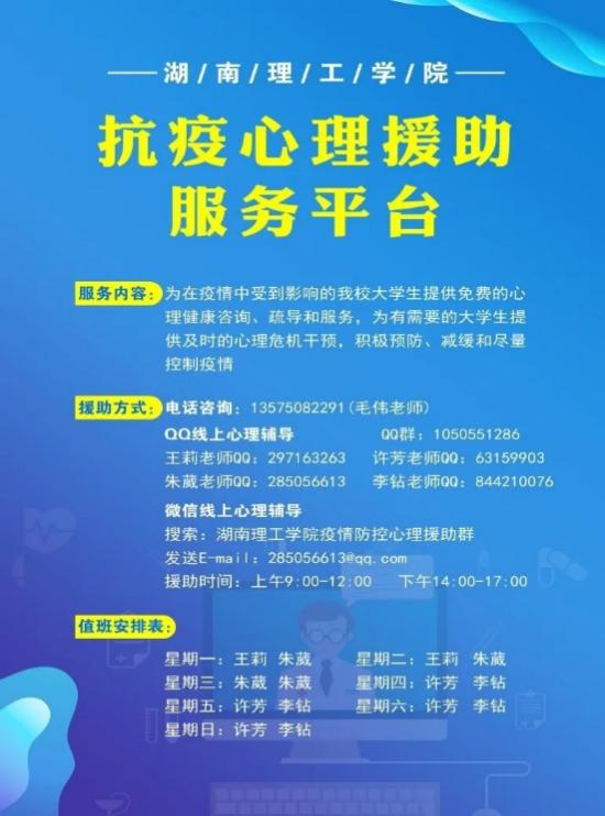 二、构建了线上心理援助平台,为广大师生穿上“心理防护服”。学工部大学生心理健康教育服务中心开通了咨询热线,建立了QQ、微信群和E-mail等疫情防控心理援助工作通道,安排了线上咨询值班,由心理健康教育专职教师值班值守,为广大师生提供心理咨询、危机干预等线上援助服务。截止到当前,已为156名师生提供了心理援助服务。