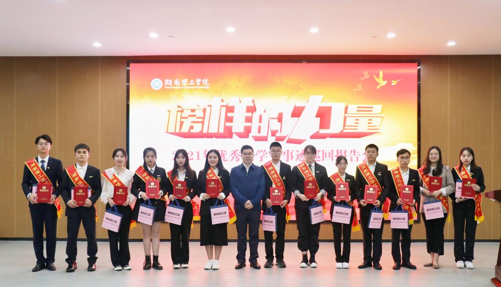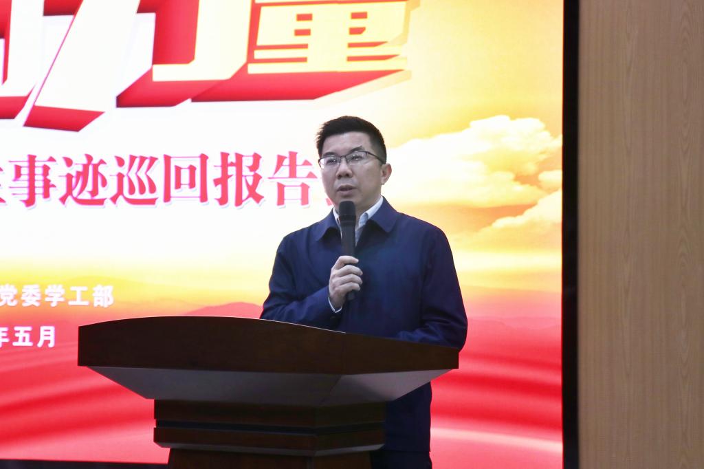 在热烈的掌声中,14位优秀大学生代表整体亮相,徐振祥为参加巡讲的同学颁发了荣誉证书和活动纪念品。体育学院党委副书记喻俊作开场发言,他结合袁隆平院士先进事迹,鼓励同学们向先进典型学习、汲取奋进力量。