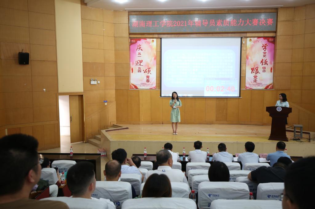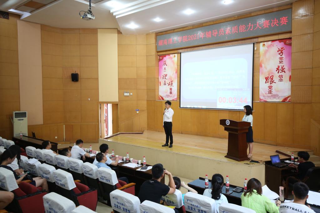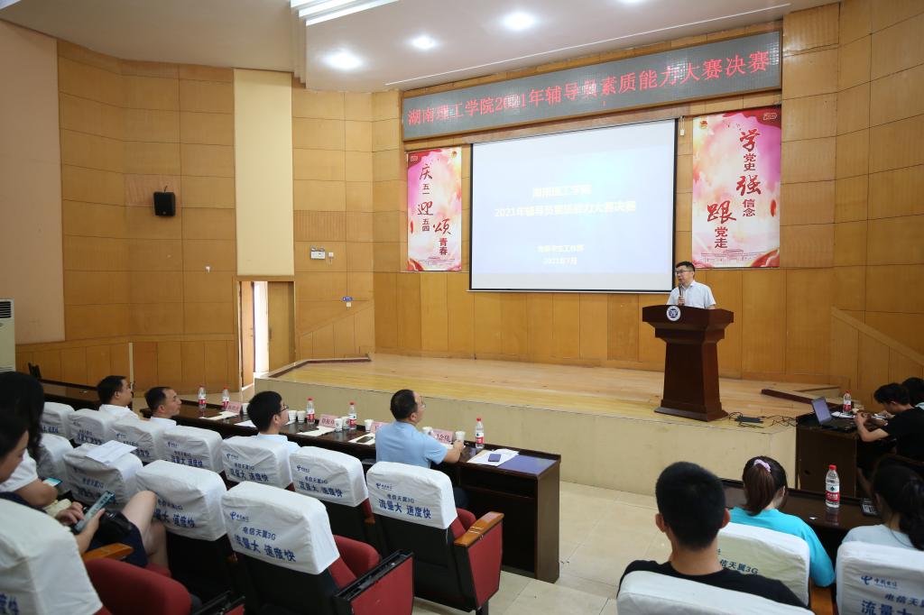 本网讯 7月14日上午,学校2021年辅导员素质能力大赛决赛在综合楼学术报告厅举行。校党委委员、副校长徐振祥,人事处处长李武,后勤处党总支书记王云朋,党委学工部部长陈绪清,校团委书记司念伟担任了比赛评委,各院系学生工作负责人和辅导员观看了比赛。