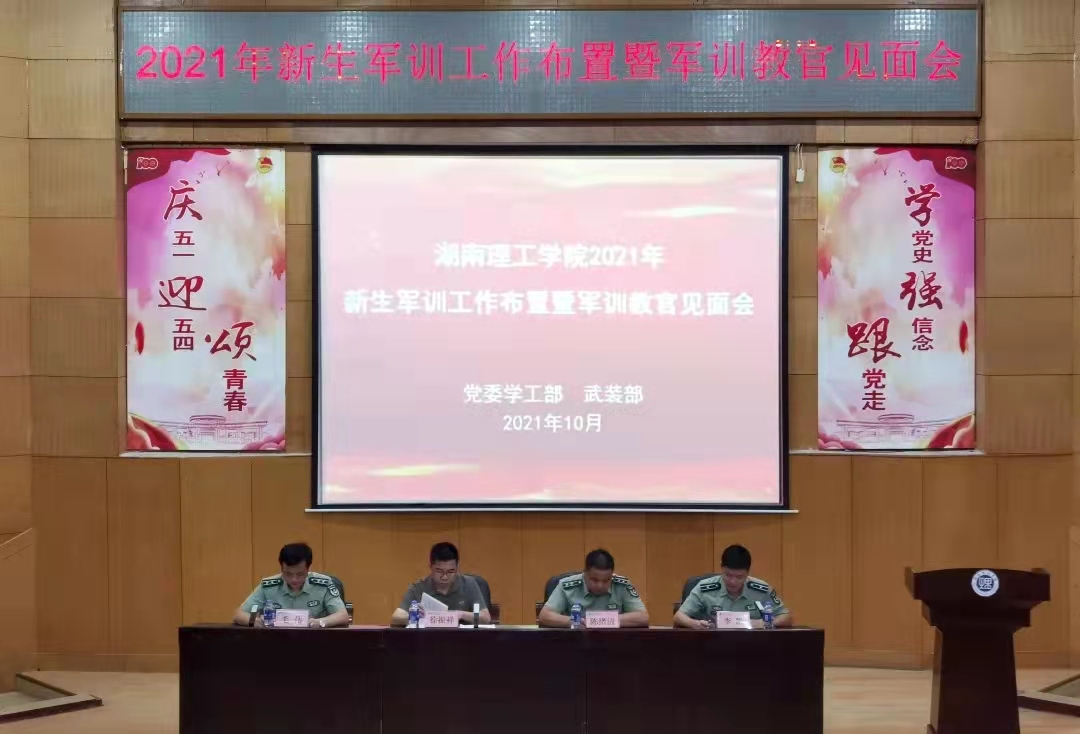 本网讯 10月1日下午,我校召开2021年新生军训工作布置暨军训教官见面会,校党委委员、副校长徐振祥,党委学工部、武装部部长陈绪清,党委学工部、武装部副部长毛伟,党委学工部副部长曾谦,各院系主管学生工作领导、全体2021级新生辅导员和带训教官参加会议。会议由陈绪清同志主持。
