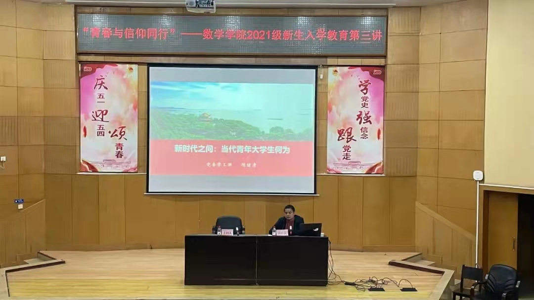 本网讯 10月28日晚7点,“青春与信仰同行”——数学学院2021级新生入学教育第三讲于综合楼学术报告厅举行。本次活动由党委学工部部长陈绪清主讲,数学学院院长周小强、党委副书记齐亮菲、各年级辅导、 2021 级全体新生参加。