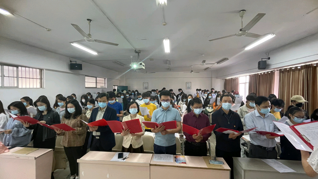 本网讯 为庆祝建团 100 周年,喜迎党的二十大胜利召开,进一步加强大学生爱国主义教育,培育大学生家国情怀,增强大学生文化自信,促进优良学风校风建设。在五四青年节来临之际数学学院开展“青春献礼二十大,强国有我新征程——大学生课前三分钟爱国朗读(第五季)”活动启动仪式。党委学工部副部长毛伟、心健中心主任李一飞、数学学院党委书记孙明保、院长周小强、副书记齐亮菲、副院长李松华、副院长黎丽梅、副院长罗德仁与学生一起朗诵经典篇目《少年中国说》。