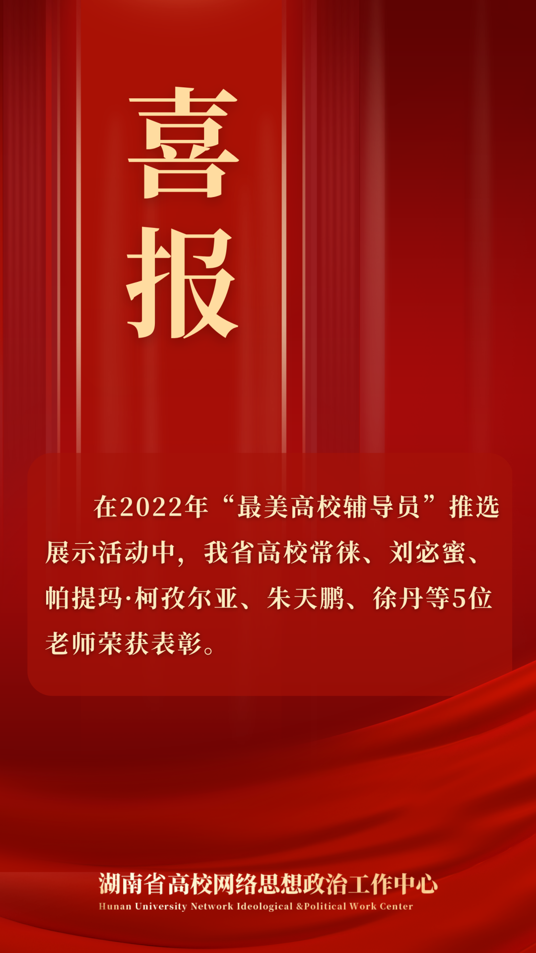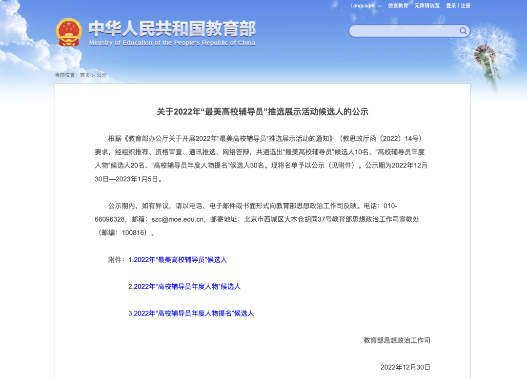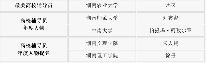 根据《教育部办公厅关于开展2022年“最美高校辅导员”推选展示活动的通知》(教思政厅函〔2022〕14号)要求,经组织推荐、资格审查、通讯推选、网络答辩,共遴选出“最美高校辅导员”候选人10名、“高校辅导员年度人物”候选人20名、“高校辅导员年度人物提名”候选人30名。