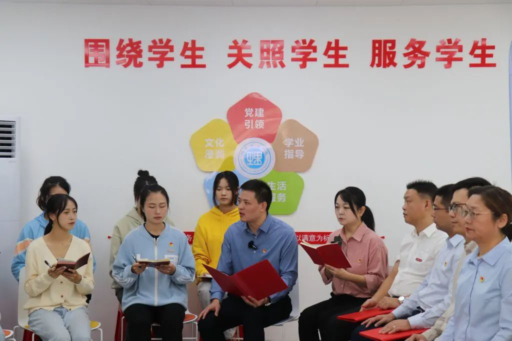 2023年11月2日上午,党委学生工作部曾谦老师,机关第二党总支书记、教务处副处长彭鑫老师,党委组织部副部长郑凤梅老师,党委保卫工作部副部长谭良机老师,招生与就业指导处副处长刘理老师,校团委副书记彭璐老师与604学理论示范寝室的同学们一起相聚在南院一站式学生社区服务中心,围绕“争做堪当民族复兴重任的时代新人”这一主题展开深入讨论交流。