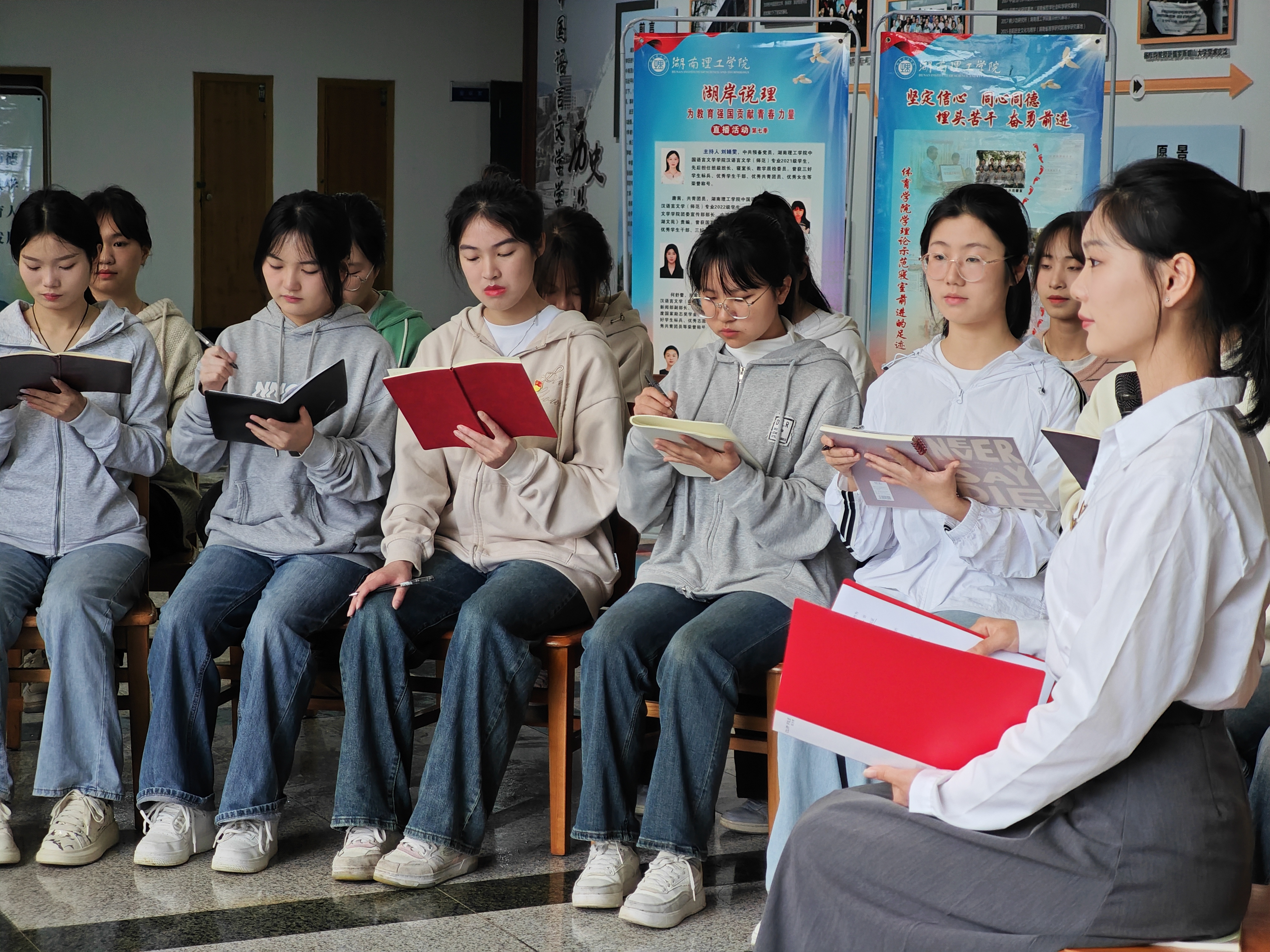 教育兴则国家兴,教育强则国家强。大学生作为教育的接受者,新时代的见证者,应为建设教育强国尽应尽之责,出应有之力。“‘苔花如米小,也学牡丹开’,作为一名师范专业的学生,我将努力汲取专业知识,夯实基础,向奋斗在教育岗位上的前辈们学习,传承教育薪火。”604学理论示范寝室的成员王鹭分享了自己读书报到时的经历,她表示建设教育强国从来不只是一句口号,坚信在不久的将来,她也可以投身基础教育一线,为教育强国贡献自己的一份力量!中国语言文学学院蒋嘉怡同学以自己的家乡岳阳为例,给大家分享了她从小到大感受到的岳阳教育的发展。作为教育强国战略的受益者,“我深刻认识到,教育强国是实现中华民族伟大复兴的基础工程,是一个长期而艰巨的任务,我将以更饱满的热情、更坚定的信念,更昂扬的斗志、更务实的作风投身到教育事业的伟大实践中去,为建设教育强国贡献自己的力量!”“十几年前小乡村的教育条件是极其有限的,许多教室的黑板都是不完整的,但是不久我们就用上了录音机,我仍然记得蒋老师把磁带放进录音机,标准的英语发音传到教室里时我内心的激动。”中国语言文学学院唐茜同学分享了她小学学习英语的经历。她说,到现在我还记得蒋老师给我的鼓励,以及她的教育方法带给我的莫大影响。作为一名00后师范生,我是新时代教育发展的见证者、受益者,更应该担当起属于自己的那份责任,成为新时代教育发展的参与者和奉献者。如今,身处大学校园,我时刻提醒自己踏踏实实学好每一门课程,精修专业技能,在未来的实习工作中将所学所得投入实践,并及时总结经验。如果有幸成为一名真正的人民教师,将励志与学生心贴心,努力成为新时代“四有”好老师!