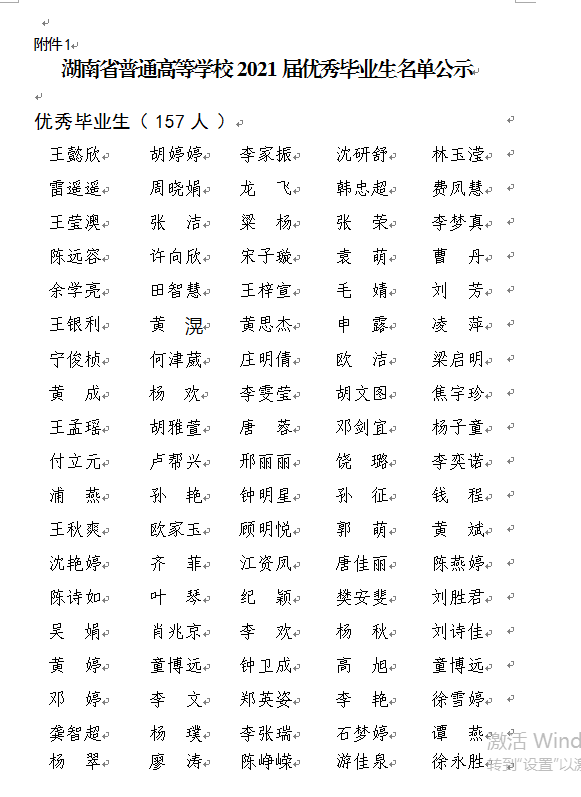 附件1:湖南省普通高等学校2021届优秀毕业生名单公示