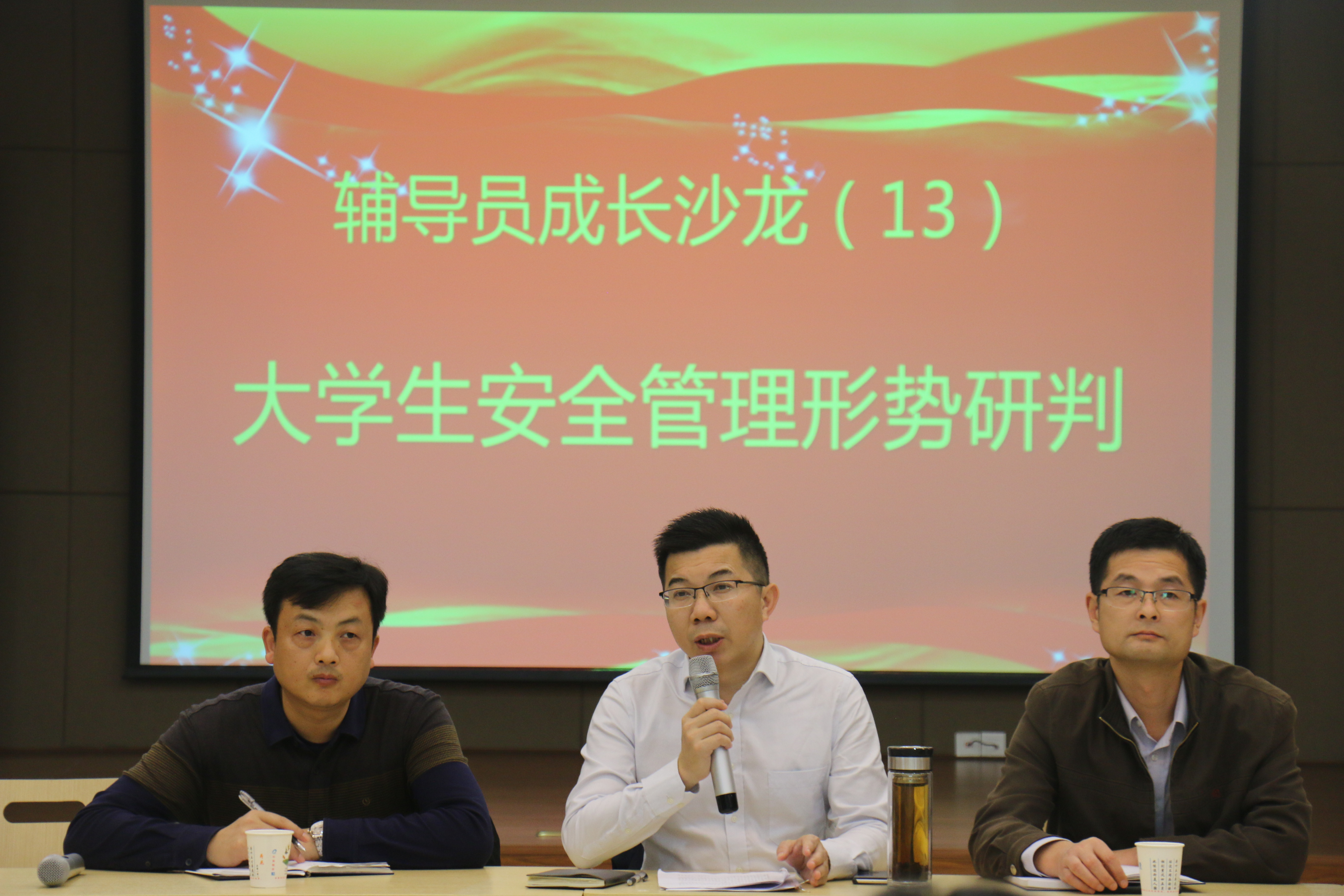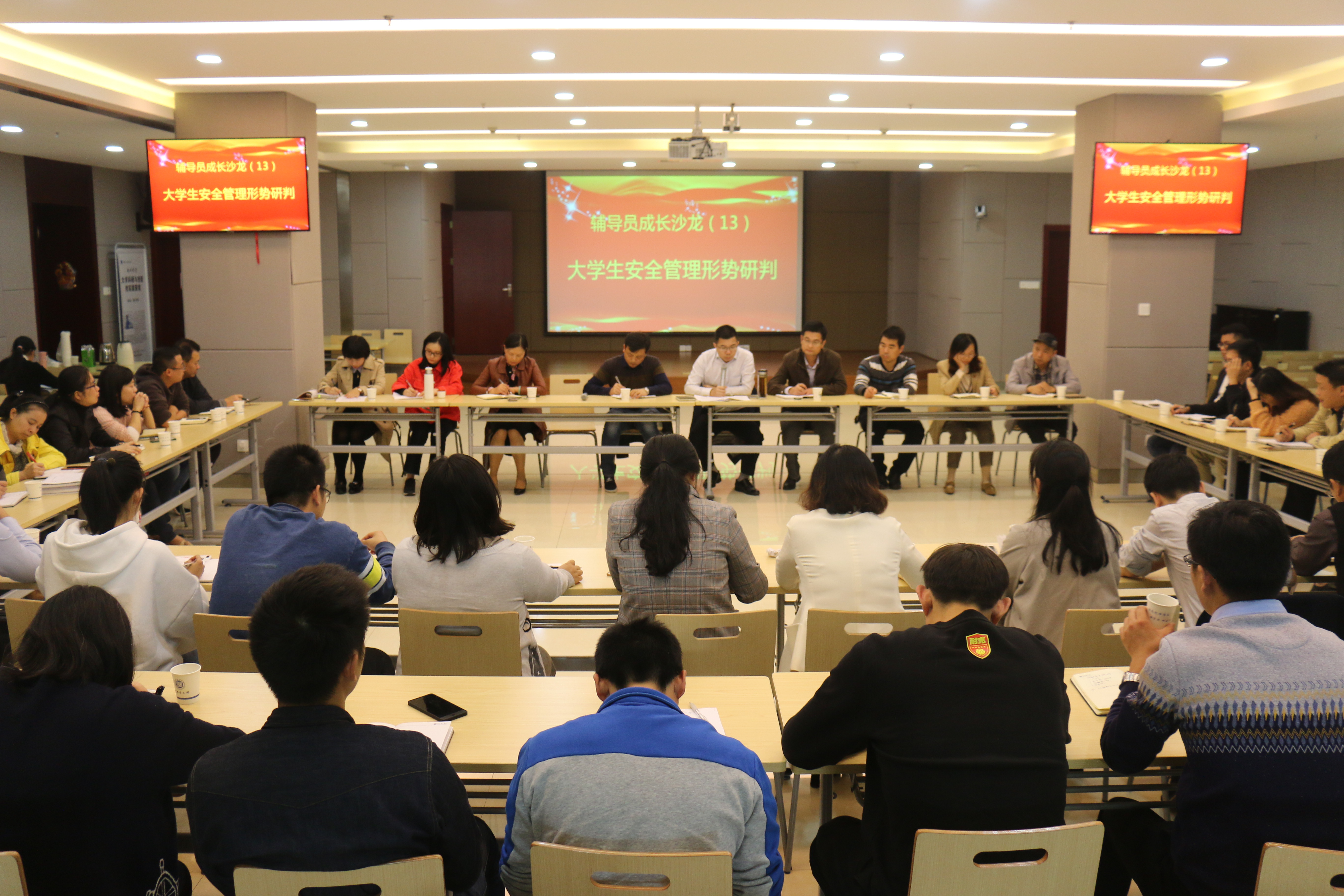 校园网讯 10月26日下午,党委学工部在图书馆一楼多功能报告厅举办辅导员成长沙龙十三期·大学生安全管理形势研判会。学工部部长徐振祥,副部长王云朋、毛伟,各学院党总支副书记,南湖分管学生工作负责人,各系党总支书记及部分辅导员参与。会议由毛伟主持。