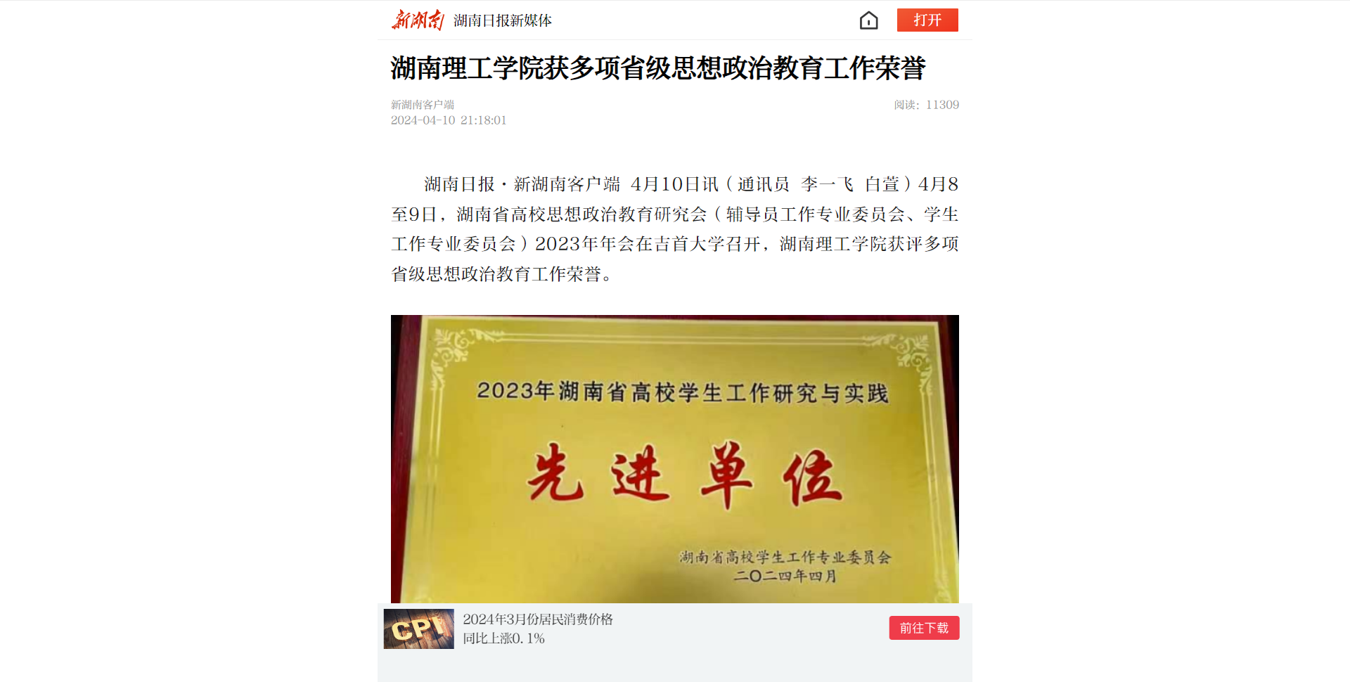 太阳网集团tcy8722获评“2023年湖南省高校学生工作研究与实践先进单位”;喻俊、单芳获评“2023年湖南省高校辅导员工作研究与实践先进个人”;李亦波、王旭智获评“2023年湖南省高校学生工作研究与实践先进个人”;余滔《“四个结合”推动“大思政课”高质量发展》论文获评“2023年湖南省高校辅导员优秀论文”;李罗娜《“五融”立体式新闻传播类大学生红色宣讲团进社区——以“声入人心、薪火相传”大学生宣讲团为例》工作案例获评“2023年湖南省高校学生思想政治教育优秀育人案例”。