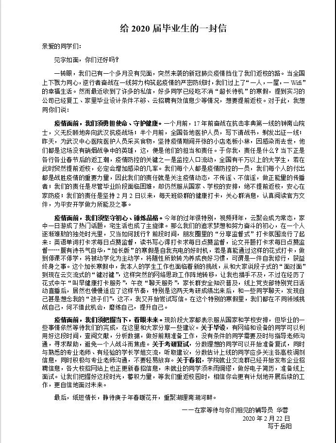 她充分利用各类网络平台,组织学生开展了“战‘疫’党员在行动”党日“云”活动,带头写下“防疫”承诺书;召开了“共抗疫情,爱国力行”主题“云”班会,通过分享医护人员、抗疫战士、志愿者的故事培养学生们的家国情怀;考虑到毕业生的特殊身份,为了缓解他们在毕业、就业、考研复试等方面的焦虑,她时刻关注同学们的QQ群、朋友圈和说说动态,时刻保持与同学们“沟通不断线”;她还写下了《给2020届毕业生的一封信》,用朴实而真诚的文字鼓励同学们勇于面对困难,共同战胜疫情。