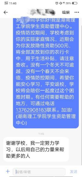 隐形资助的方式,是学校一直坚持的资助方式之一,根据大数据分析选择资助对象,既保护了学生的隐私,也解决了学生的实际困难。来自学校的关爱,让罗同学十分感动,他回复给学校资助管理中心老师这样一条信息:“谢谢学校,我一定努力学习,以后用自己的力量来帮助更多的人。”