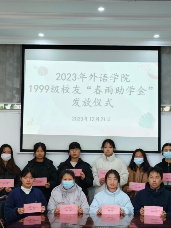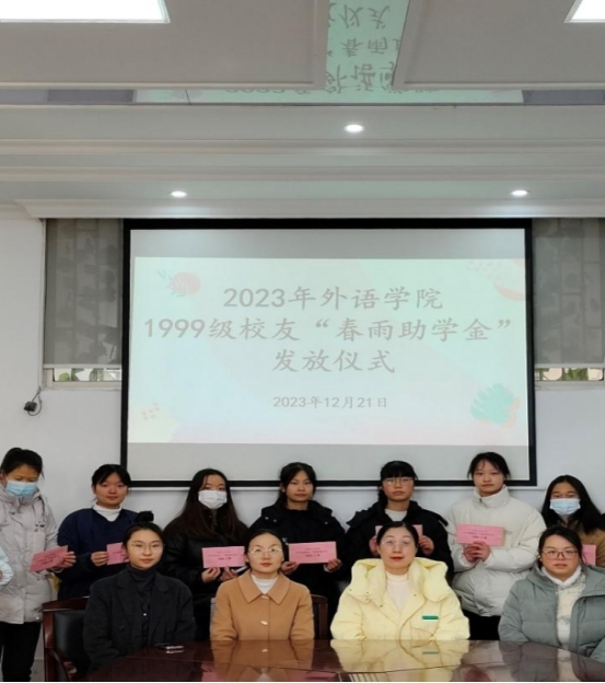 本网讯12月21日上午,外语学院于8106举办2023年度1999级校友“春雨助学金”发放仪式。外语学院党委副书记石红芳、2020级辅导员陈冰、2021级辅导员周伟芳、2022级和2023级辅导员殷成韵及受助学生出席本次活动。