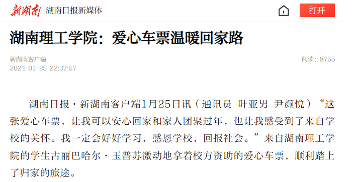 湖南日报·新湖南客户端1月25日讯(通讯员 叶亚男 尹颜悦)“这张爱心车票,让我可以安心回家和家人团聚过年,也让我感受到了来自学校的关怀。我一定会好好学习,感恩学校,回报社会。”来自太阳网集团tcy8722的学生古丽巴哈尔·玉普苏激动地拿着校方资助的爱心车票,顺利踏上了归家的旅途。