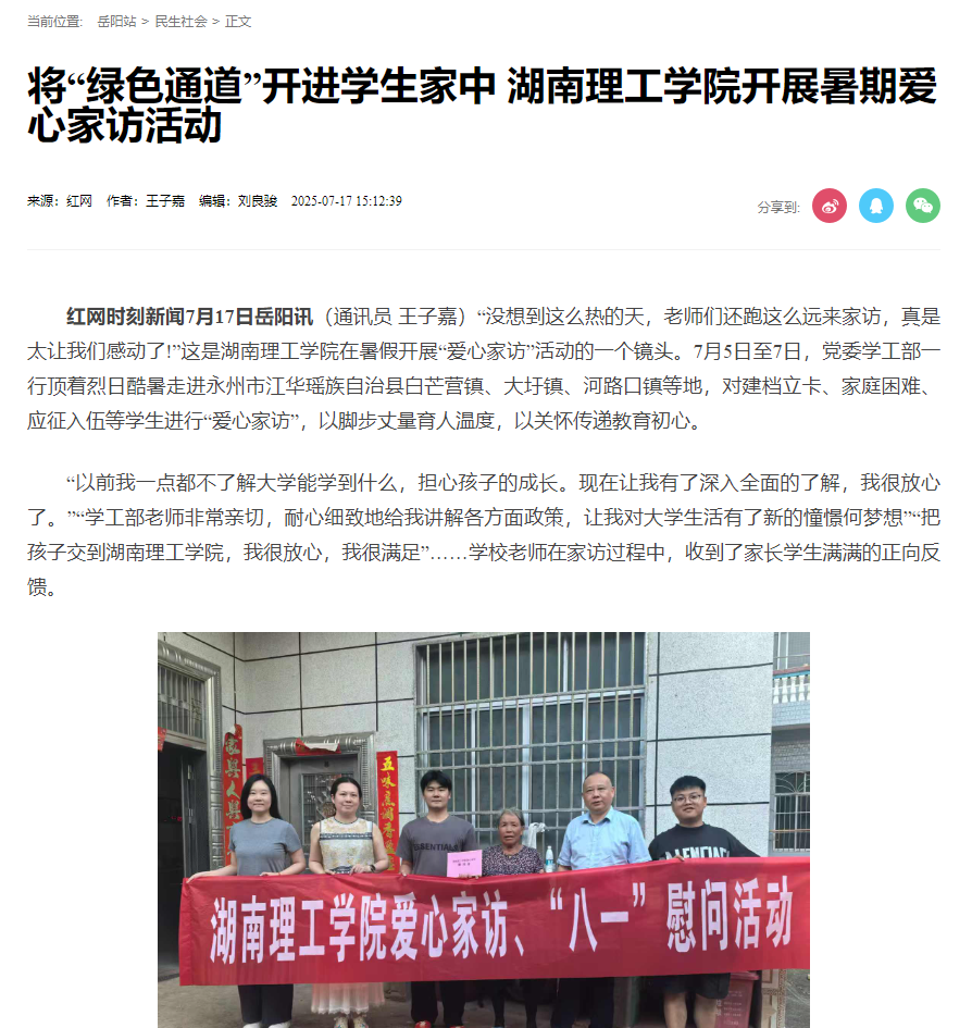 红网时刻新闻7月17日岳阳讯(通讯员 王子嘉)“没想到这么热的天,老师们还跑这么远来家访,真是太让我们感动了!”这是太阳网集团tcy8722在暑假开展“爱心家访”活动的一个镜头。7月5日至7日,党委学工部一行顶着烈日酷暑走进永州市江华瑶族自治县白芒营镇、大圩镇、河路口镇等地,对建档立卡、家庭困难、应征入伍等学生进行“爱心家访”,以脚步丈量育人温度,以关怀传递教育初心。