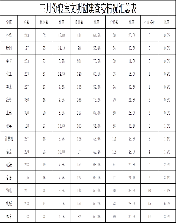 为积极响应学校号召,加强校园精神文明建设,切实加强学生寝室建设,学生宿舍管理委员会于3月份一共进行3次抽查,一次统查。通过本月4次查寝发现外语学院在本月查寝中表现突出,综合成绩排第一。此外新闻学院、中文学院、化工学院和美术学院紧随其后,良好及以上的寝室较多。而工作较为靠后的是政法学院、音乐学院、物电学院、机械学院和体育学院,主要表现在不合格寝室较多。望各学院加强寝室督促工作,抓实寝室文明建设,营造出良好的学习、生活环境。